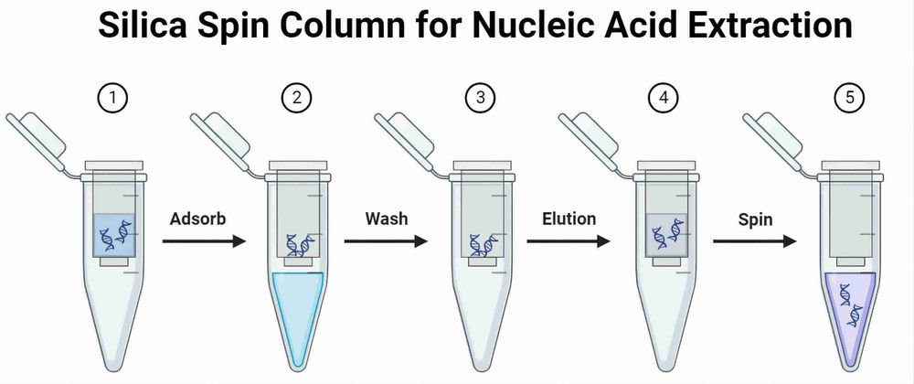 Silica spin columns with unique adsorption capacity and buffer system specifically bind nucleic acids in the presence of high concentrations of chaotropic salts and wash away impurities. After centrifugation, DNA and RNA are eluted from the silica membrane in water or low salt buffer. The result is highly pure DNA and RNA for biological applications such as PCR, real-time PCR, sequencing, Southern blotting, cloning and genotyping.