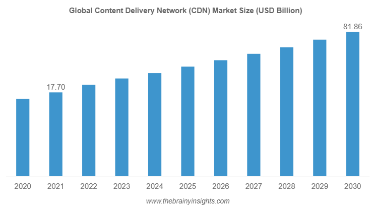 The global content delivery network (CDN) market is projected to reach USD 81.86 billion by 2030, growing at a compound annual growth rate (CAGR) of 18.55% from 2022 to 2030.