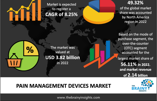 The global pain management devices market was valued at USD 3.82 billion in 2022 and is expected to grow at a CAGR of 8.25% from 2022 to 2030, reaching an estimated USD 7.20 billion by the end of the forecast period.